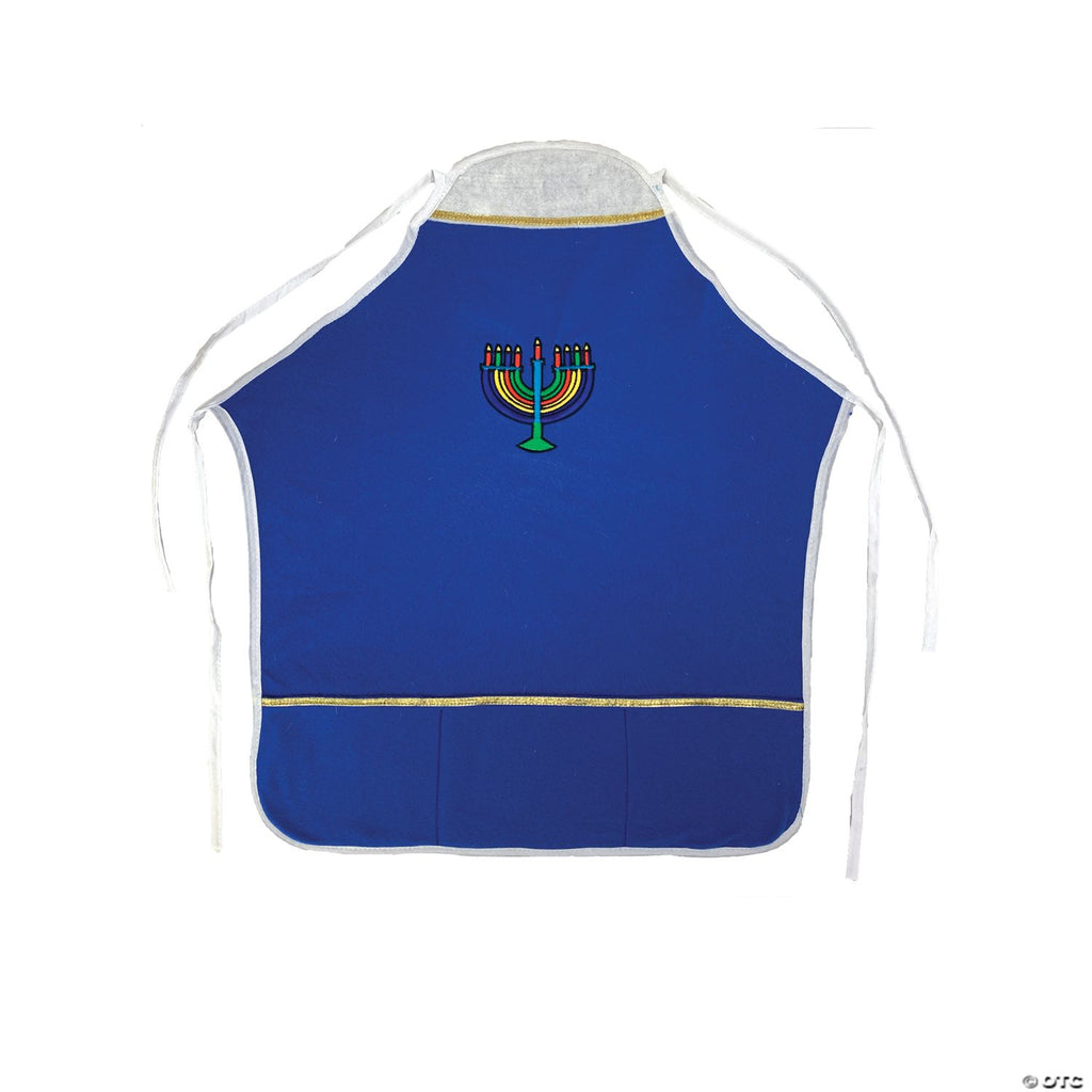 Soft Blue Hannukah Apron with golden trims and pockets has a colorful embroidered Menorah on the chest area! White Ties around the Neck and the Waist hold the apron in place. Covers the chest down to approximately mid-thigh. Festive covering for your next holiday season!