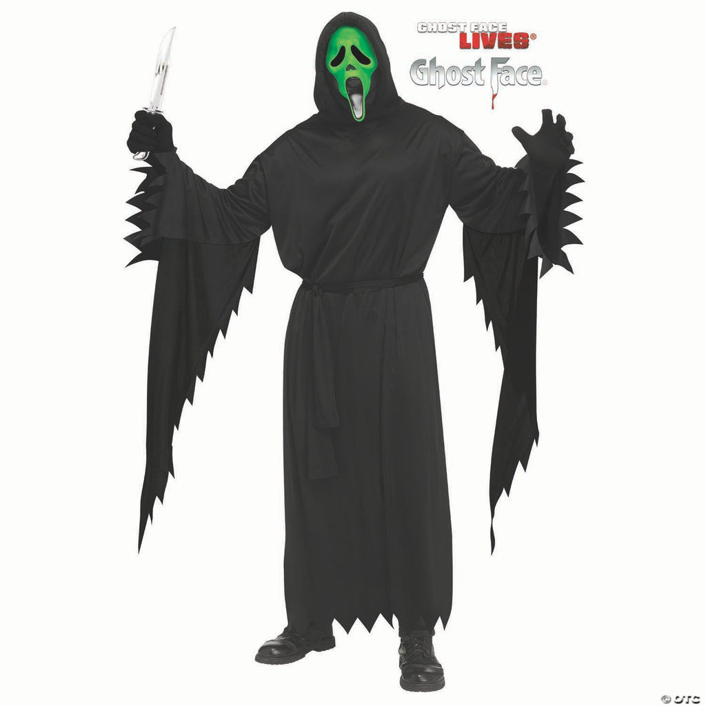 Create an eerie glowing look for your next Halloween costume! Our Adult Ghost Face Fluorescent Costume features a black hooded robe, a belt, a pair of gloves, and a creepy green fluorescent mask. One size fits most adults up to 6 ft, 200 lbs. Made of 100% polyester. Spot clean with damp cloth, then air dry. Do not bleach, do not dry clean. GHOST FACE protected under worldwide copyright registration, and is the exclusive property of Fun World Div., Easter Unlimited, Inc. All Rights Reserved. GHOST FACE, GHOST FACE LIVES and THE ICON OF HALLOWEEN are registered trademarks of Fun World Div., Easter Unlimited Inc. All Rights Reserved. Fun World is a registered trademark of Easter Unlimited, Inc. All Rights Reserved.