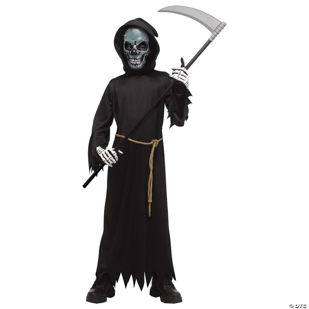 • TRANSFORM INTO SCARY CHARACTERS: Let your kids embody spine-tingling characters from their favorite movies, TV shows, and video games, bringing hair-raising excitement to their Halloween celebrations.br • PARTICIPATE IN A HAUNTED HOUSE: Prepping to be part of a haunted house at school or home is easy thanks to our graveyard of wickedly fun costumes, props and accessories.br • SCARE UP SOME FAMILY MEMORIES: Bring your family together to choose costumes, engage in Halloween activities, indulge in themed photoshoots, and create delightful memories that will scare up smiles for years to come.br br Product Description:br Electro Skull Reaper has a unique light-up face mask that tops a simple black hooded robe with a half rope belt. Includes black gloves with skeleton bones on the back. The silvery grey face mask has a striking neon blue skull outline light effect which blinks at several different speeds. Requires 2 AA batteries, not included. Child Large fits sizes 12-14.