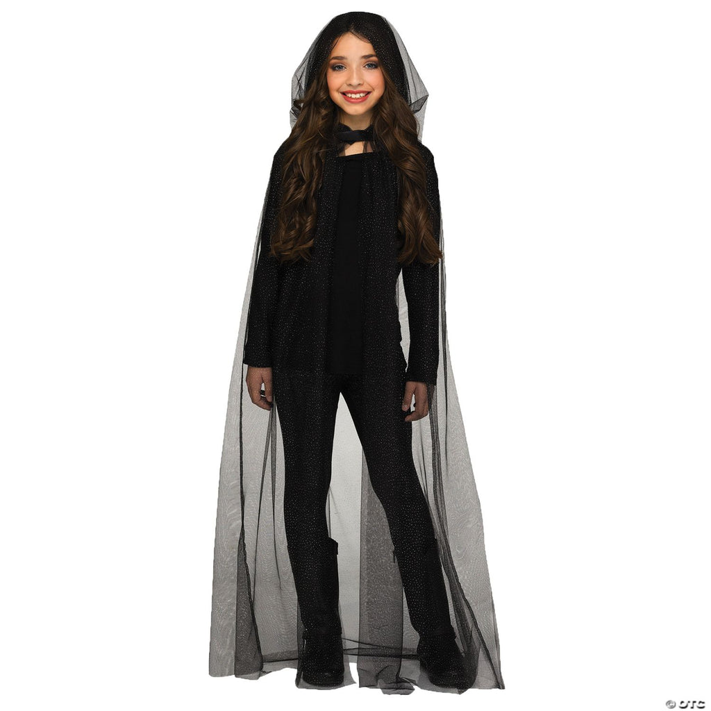 Lovely Hooded Sparkle Cape will be a great add-on to many costumes! Sheer black glitter fabric will sparkle in the dark, and the full length front-closure cape will flow gracefully when you walk. Also, your lovely costume will still be visible, although it will look very pretty with black shirt and pants, as shown. Many possibilities! One size fits most children up to size 14.