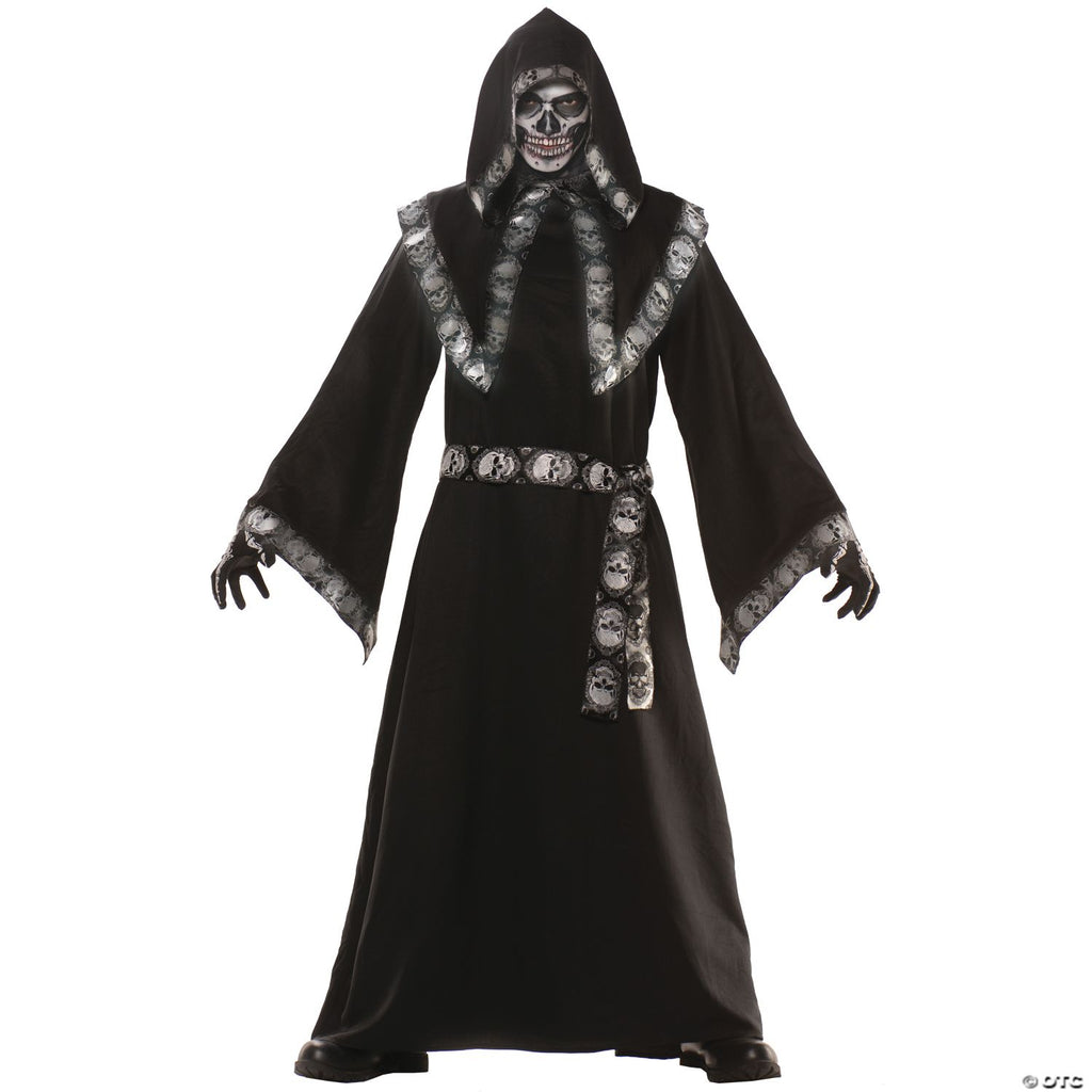 Strike fear in the heart of the stoutest soul with this amazing costume! Become the keeper of the crypt! Full length skull printed jacquard trim tunic with attached shawl and hood belt.