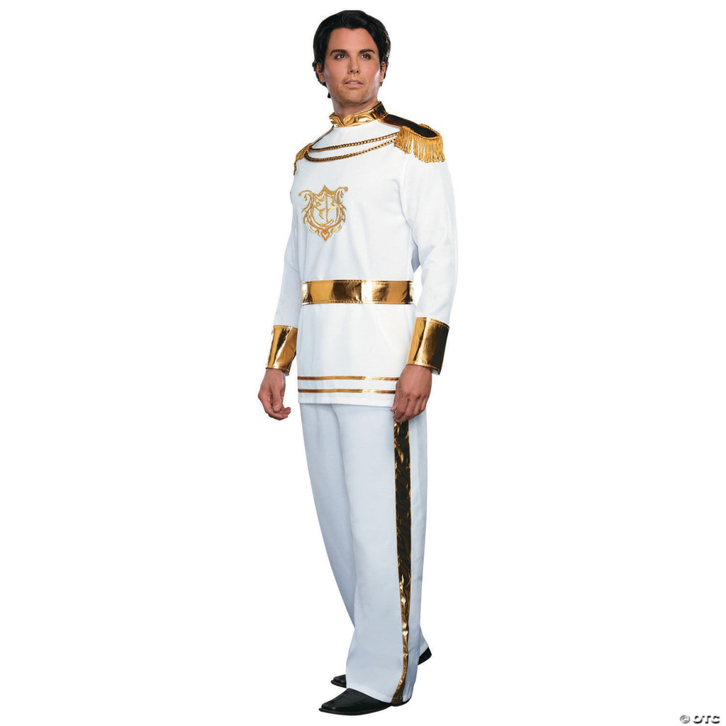Finding a princess can be hard to do not every fair maiden can fit in that glass shoe! Poised like the prince you are couple up with your princess as you head out into the night in this white tunic with gold accents and white elastic waist pants. 100% Polyester. 36 inches-38 inches and chest 42 inches-44 inches.