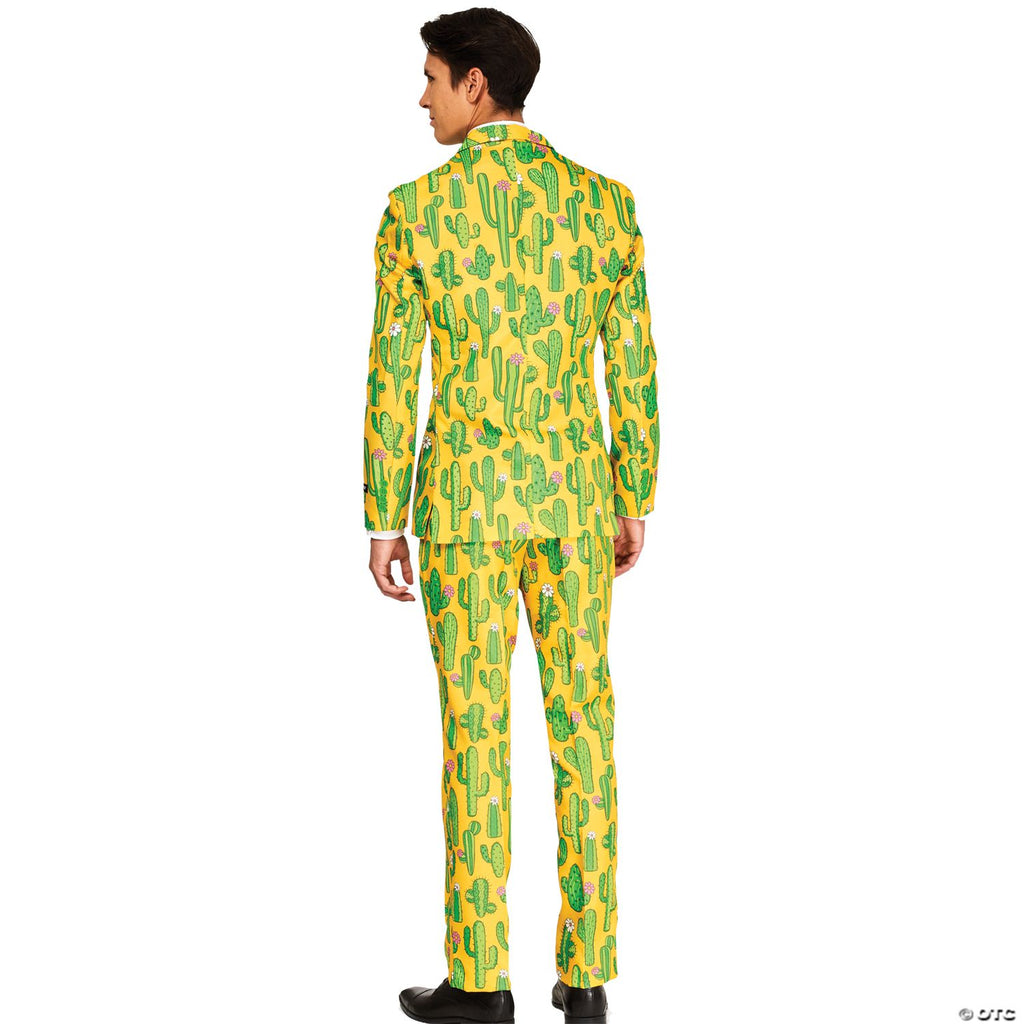 This brightly-colored yellow suit with green cactus design sings of the American Southwest and would be great for Cinco de Mayo, aQuinceanera, or just when you are wanting to go out and have a Margarita! No matter where you go, you will look fabulous! Includes a jacket, tie, and pants. Slim fit. Add your own favorite shirt. Many quality finishing touches:JACKET DETAILS:· 2-button front· 4 Inside pockets· 4-button cuff· Double-vented back· Front flap pockets· Fully lined· Left chest pocket· Notch lapels· Padded Shoulders· Regular lengthPANTS DETAILS:· 2 Back button-through pockets· 2 Side pockets· Belt loops· Extra fabric in Waistband and seams for tailoring· Zip fly with hook and button closure
