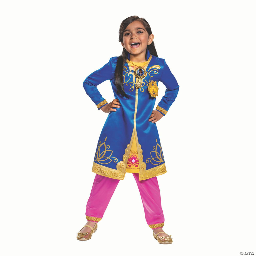 Your preschooler will have a magical time solving mysteries when dressing up as Mira, Royal Detective from the Disney Junior animated series! Travel through the magical kingdom of Jalpur to solve mysteries as the brave Mira! The Disney Mira Royal Detective Deluxe Costume features a knee length blue jacket with gold trim, pink pants with gold trim and a magnifying glass necklace with character cameo. Shoes not included.© Disney
