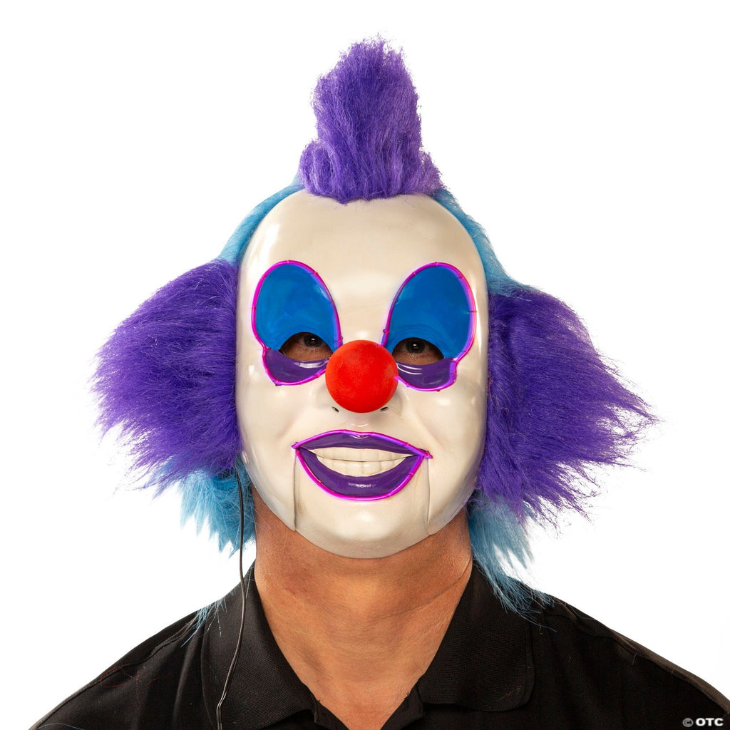 Win the Funniest Mask award at the party! You can be scary or cheerful with our Classic Purple/Blue Clown Light-Up Mask with Hair! Fun moving-mouth feature adds to the eerie effect! Hard plastic mask has a jaw cup that allows the mouth to move when you are talking and clowning around! Purple LED lights around the eyes and mouth feature 4 different light settings and require 2 AA batteries .Fits most adults.