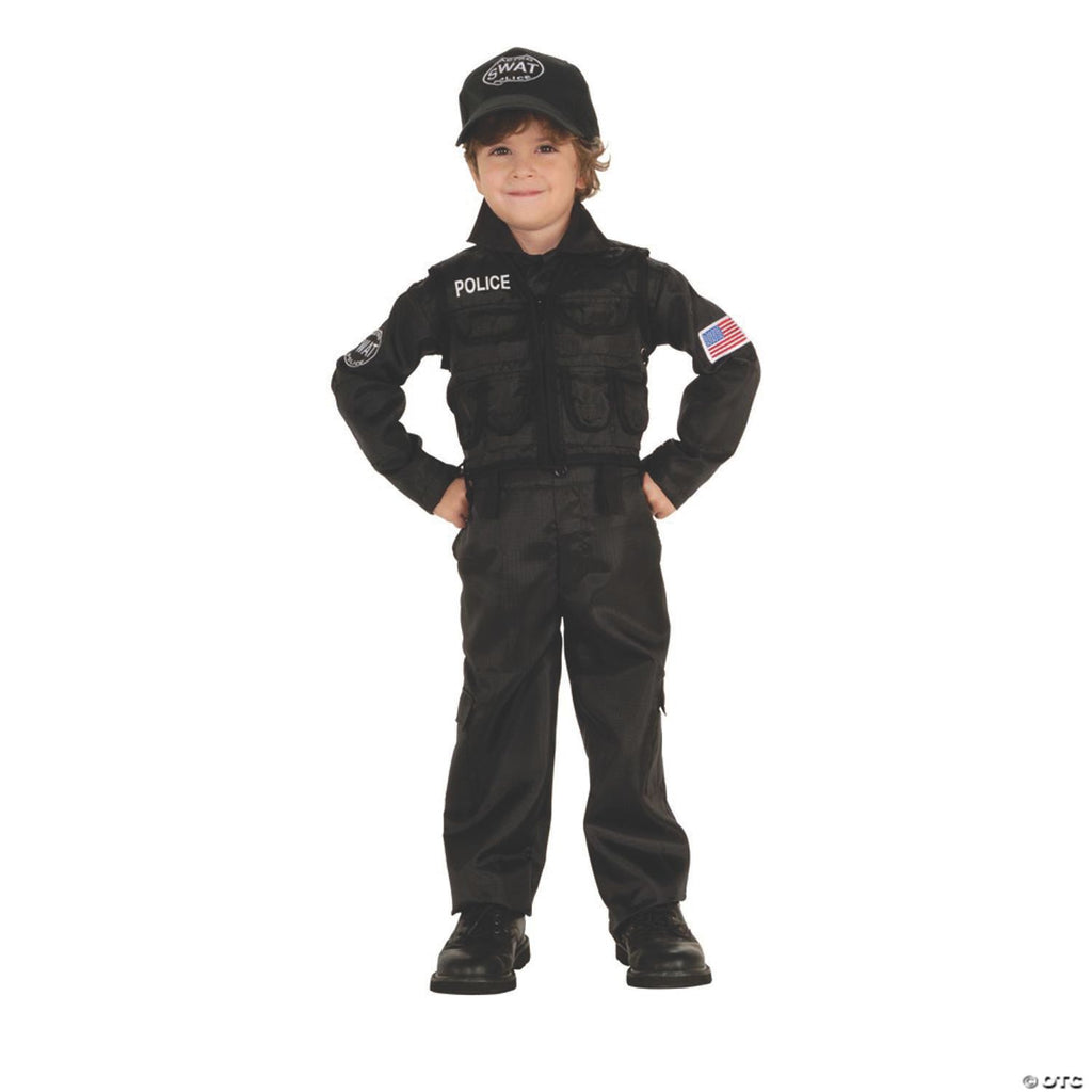 Come to the rescue in this great SWAT police costume! Authentic-style shirt vest pants and hat. Toddler fits sizes 2-4.
