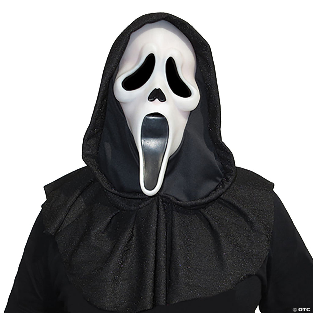 Scare all your friends when you wear this 25th Anniversary Scream Mask! The Movie Replica Vinyl Mask has black mesh eyes for good vision and an attached black Hood with a subtle metallic glint. A Black Elastic Head Band keeps the mask in place under the hood. A small invisible air hole near the mouth gives air circulation. Just add a black robe for the complete look!