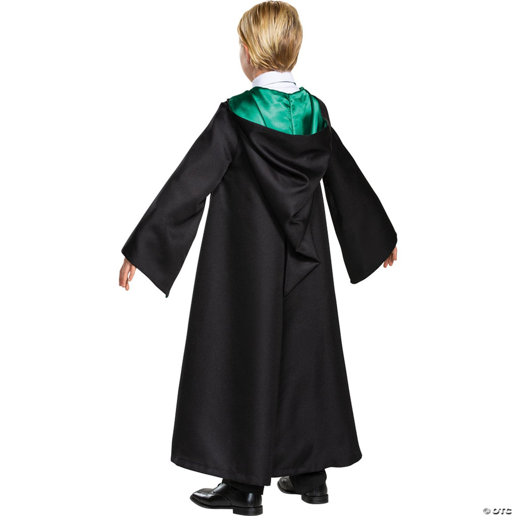 Swish your black robe and make a dramatic entrance this Halloween dressed in this Prestige Harry Potter Slytherin Robe. Grab your wand and let the magic begin when you wander the halls of Hogwarts School of Witchcraft and Wizardy. Represent your Hogwarts House and carry on Salazar Slytherin’s legacy dressed in this high quality Harry Potter Slytherin The Harry Potter Child’s Prestige Slytherin Robe features a black robe with Slytherin crest and green satin lined hood, sleeves and lapels. Pants, white shirt, tie, wand and shoes not included.HARRY POTTER characters, names and related indicia are © 2020 Warner Bros. Entertainment Inc. WB SHIELD: © 2020 WIZARDING WORLD trademark and logo © 2020 Warner Bros. Entertainment Inc. Publishing Rights © JKR. (s19)
