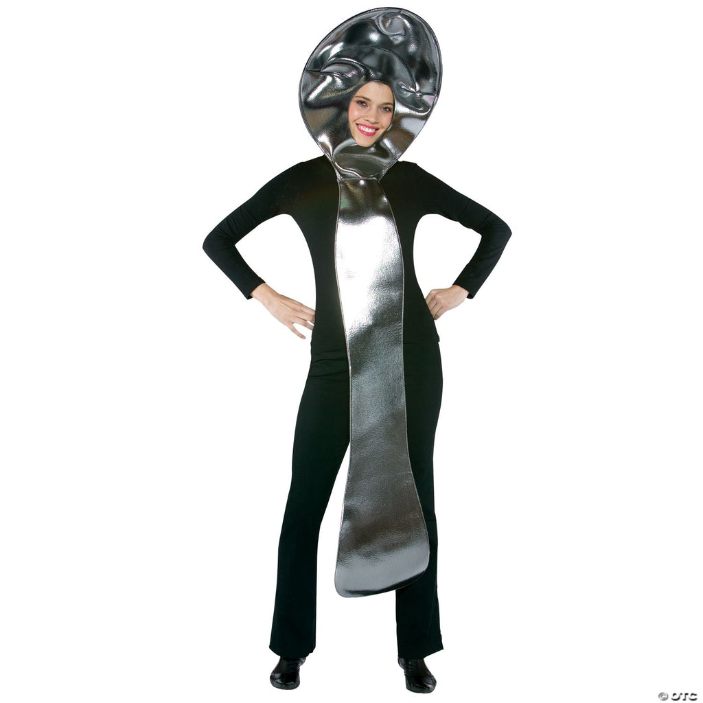 In the mood for spooning? Or is it too spoon? Throw on this adult spoon costume and you can spoon feed puns all night long! Costume includes poly-foam over-the-head tunic that looks like a giant silver metallic spoon with an opening for the face. Tell Mr. Fork and Mr. Knife that you will see them spoon! Cute group costume idea for some punny people! One size fits most up to 6 foot 3 inches tall, 48 to 53 inch chest size.