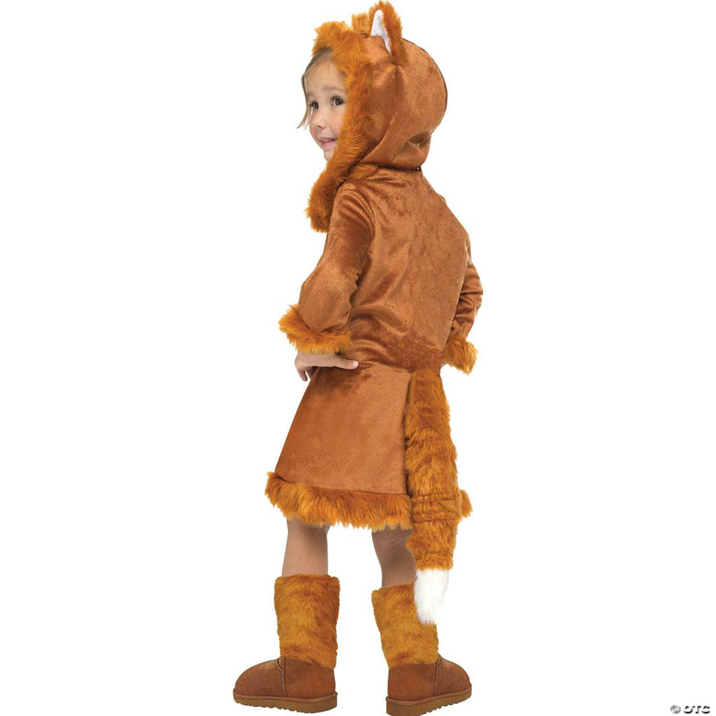 Perfect for your own little fox! Brown velvet dress with fluffy trim, matching plush hood with ears and poms, tail and boot covers.