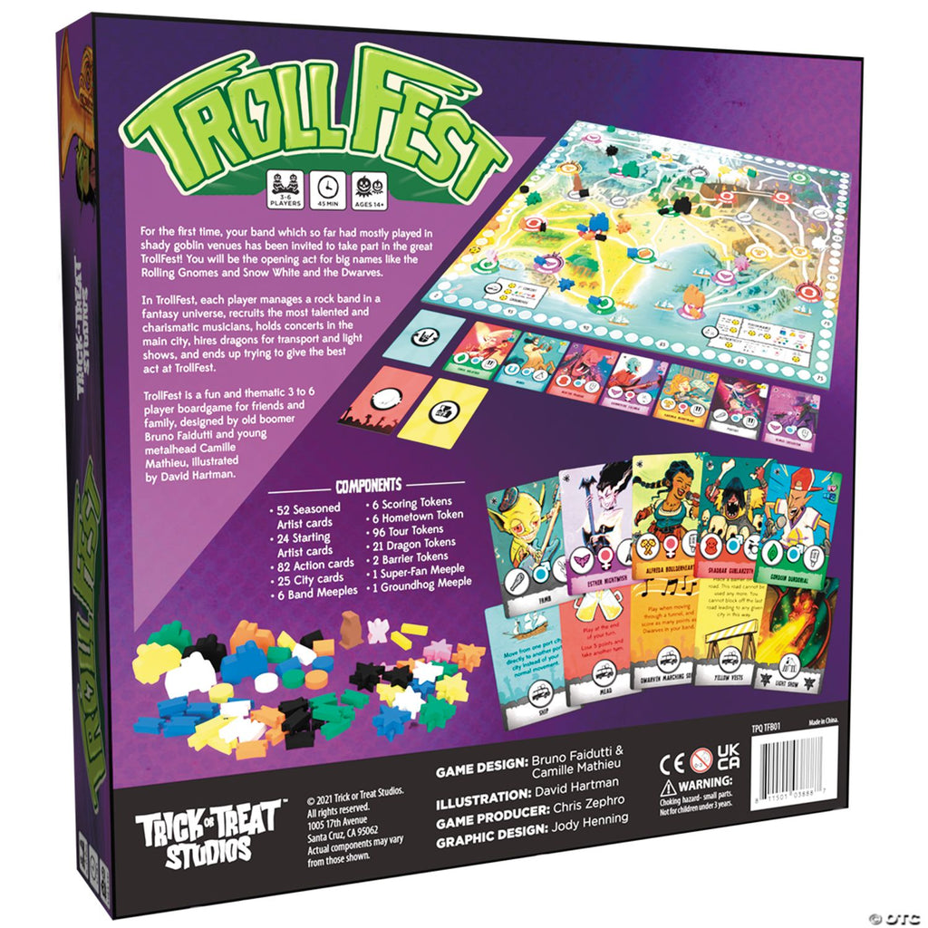For the first time, your band which so far had mostly played in shady goblin venues has been invited to take part in the great TrollFest! You will be the opening act for big names like the Rolling Gnomes and Snow White and the Dwarves. In TrollFest, each player manages a rock band in a fantasy universe, recruits the most talented and charismatic musicians, holds concerts in the main city, hires dragons for transport and light show, and ends up trying to give the best act at TrollFest. TrollFest is a fun 3 to 6 player boardgame for friends and family designed by old boomer Bruno Faidutii and young metalhead Camille Mathieu, illustrated by David Hartman. For 3-6 players. Play Time 45 Minutes. Age Range 13+. © 2021 Trick or Treat Studios.