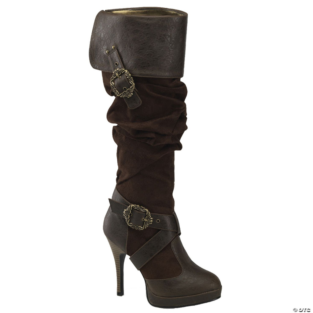 Take your sexy pirate costume to the next level with these magnificent knee high platform boots. They feature brown slouched faux-suede and a thick fold over polyurethane cuff that looks like distressed leather. These stunning female pirate boots are adorned with intricate octopus buckles, faux-leather straps, and a wood-like 4 1/2 inch heel. And the best part-they are easy to get on and off with the full-length inner leg zipper. Get ready to turn heads!
