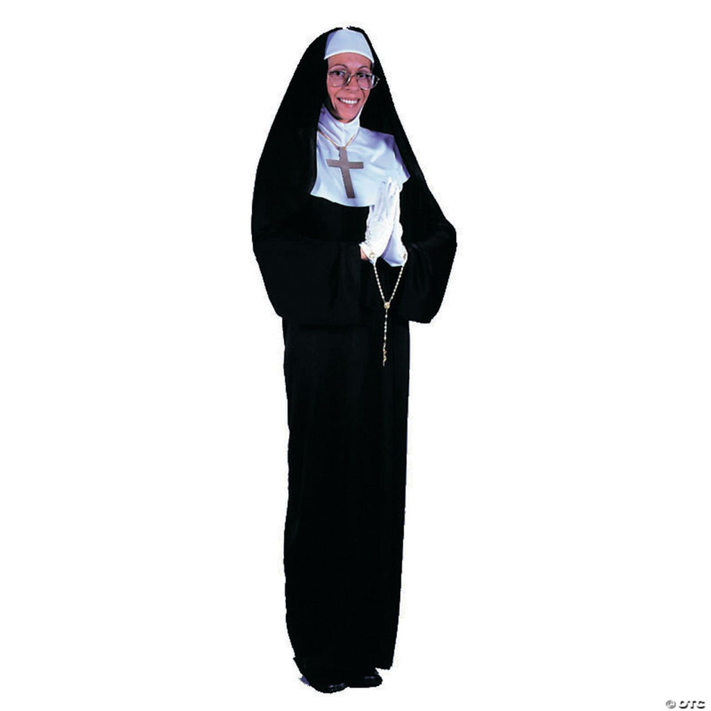 Nun costume includes a lightweight black dress with drape sleeves, a 2 piece habit and a pair of gloves. The habit consists of a white hood that has a velcro closure in the back and the attached piece on hood hangs to about chest length. It also includes a headpiece with a white band to cover forehead and a black drape that covers head and hangs to shoulder length, small elastic piece in back for size variance. Plus size 16-22. 100% polyester.