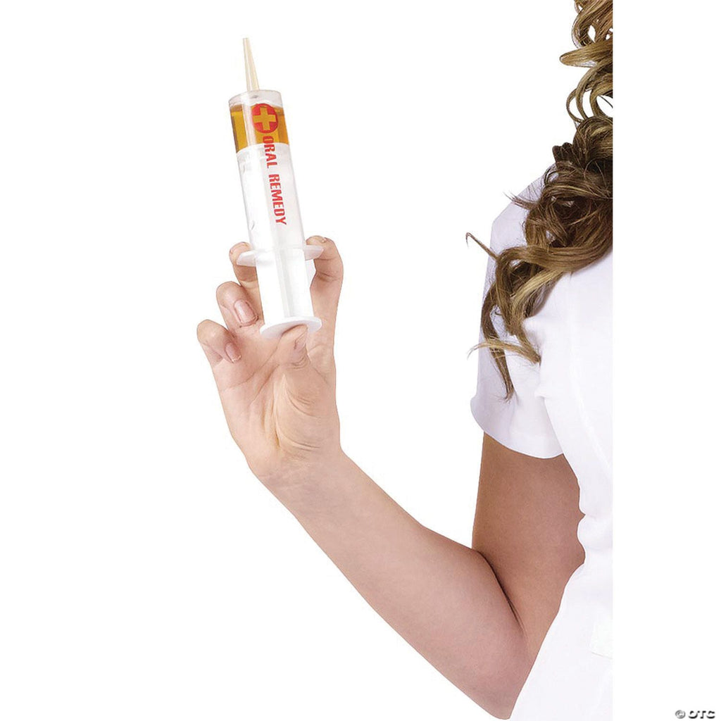 Nurse's minidress has loops to hold 2 shot syringes and includes cap and stethoscope.