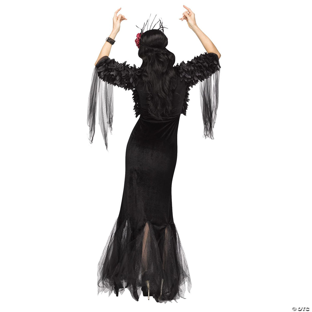This Halloween transform into the Raven Mistress and be the master of the bird of ill omen. Just like the raven, this costume exudes darkness and mystery. This magnificent women costume includes the black floor length gown and feather-inspired black shrug with flowing strands of tulle on the sleeves. Also included is the flower head piece with skull detail.