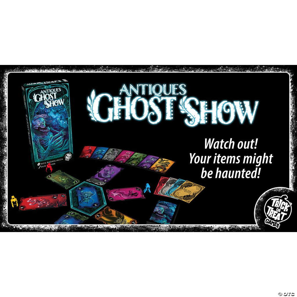 This board game has each participant playing as an antique dealer trying to leave an estate with the least haunted valuables to sell to wealthy collectors. It is the perfect party activity for 2 to 4 players, ages 14+. • Material: Includes 63 item cards, 7 collector cards, 4 invitation cards, 4 custom wooden player pawns, 2 auction house boards, rulebook. • Quantity: 1 • © 2025 Trick or Treat Studios
