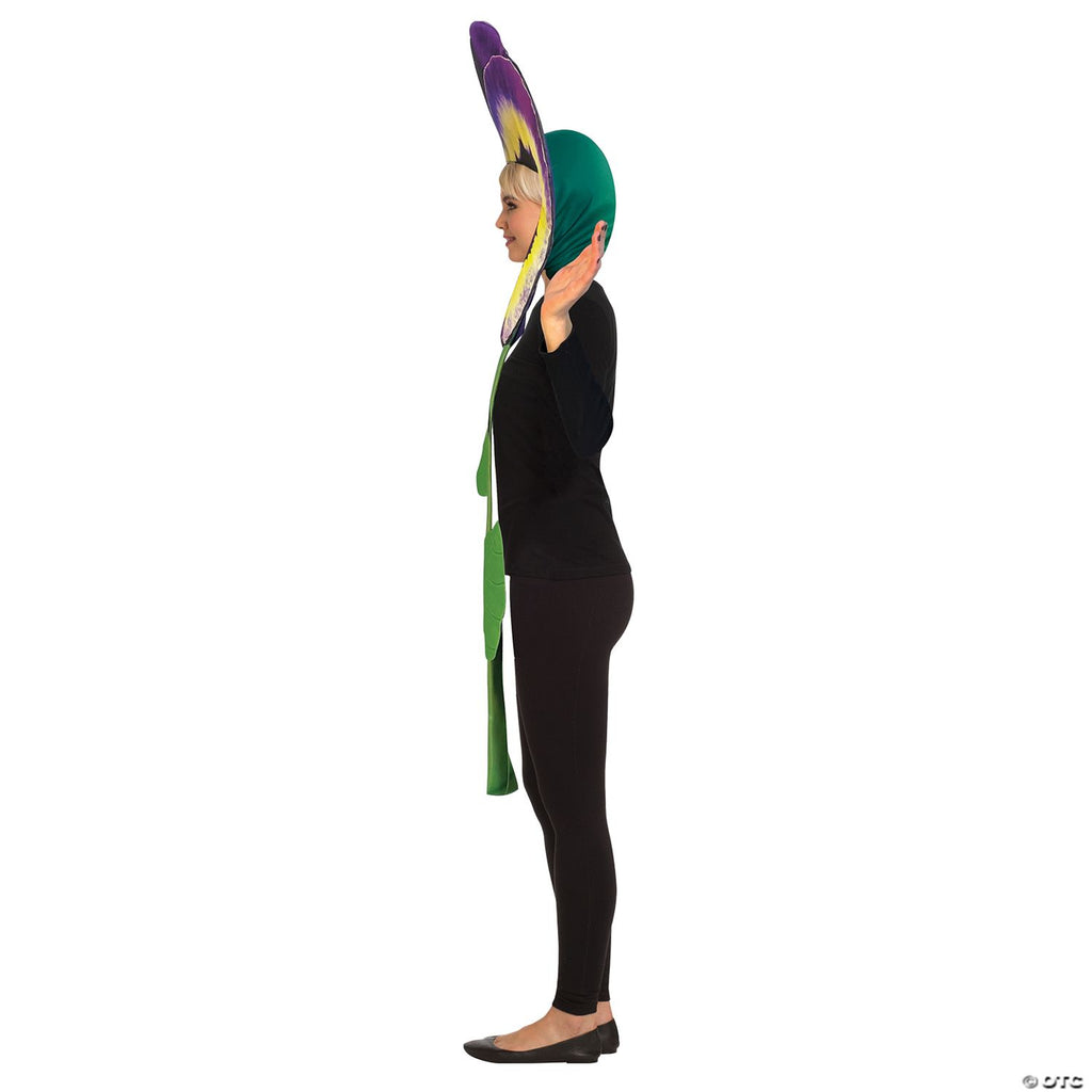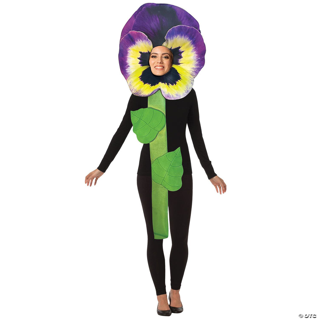 Don't get your pansies in a bunch! Bloom in this Purple Pansy Flower Costume. The costume includes a head in one piece tunic with an open face for easy eating and drinking. It has a hard Velcro back closing. It is printed on the front only with 3D leaves on the stem. One Size fits most adults.