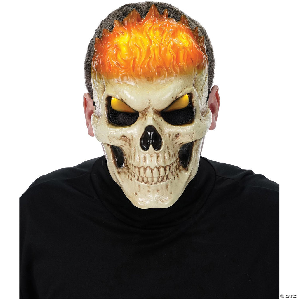 Light the night up with this Flaming Inferno Skull Mask. Eerie LED eyes glow orange while hair is illuminated by a flickering flame panel. Looks great on its own and even creepier with a costume. Either way, your look will be “on fire”. Includes fabric hood, elastic strap, and foam square at the forehead for comfort. One size fits most adults.