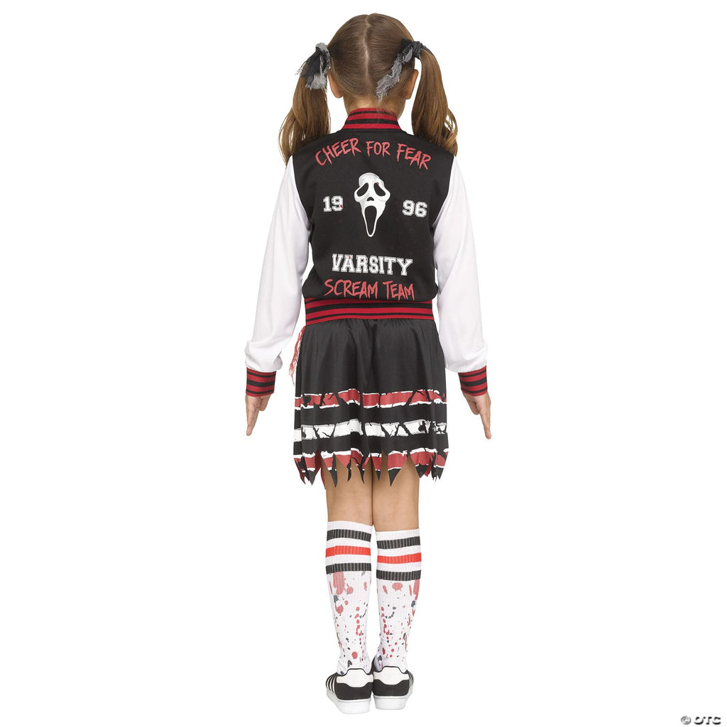 • ENHANCE TRICK-OR-TREATING: Dressing up your kids in exciting costumes will make their trick-or-treating experience even more enchanting and memorable, as they bring joy and excitement to every doorstep they visit.br • PARTICIPATE IN SCHOOL EVENTS: Kids costumes are essential for school Halloween parties, parades, or theatrical performances, allowing kids to fully participate in the festive spirit and showcase their creative and imaginative sides.br • HAVE FUN AT COSTUME PARTIES: Attending costume parties during the Halloween season is a blast for kids, as they get the chance to show off their costumes, dance, play games, and enjoy a night filled with laughter and fun.br br Product Description:br Fun Scream for the Team one-piece dress looks just like a cheerleader varsity jacket and skirt! Iconic spooky graphic prints show up on the front and back of the jacket. Wispy red and white gauze accents the waistline. Officially-licensed Ghost Face® costume comes with a matching pair of blood spattered socks and includes 2 red & black pom poms! Add your own shoes for the complete look. Child Large fits sizes 12-14.