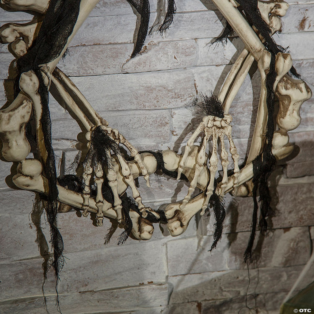 Your victims will know you're in the spirit of the season when they see this all-bone wreath on your door at your Halloween party. Light-up skull eyes give a very creepy staring look. Chilling! This measures approximately 14.6in x 16.5in x 2.8in. Uses 2 AA batteries not included.