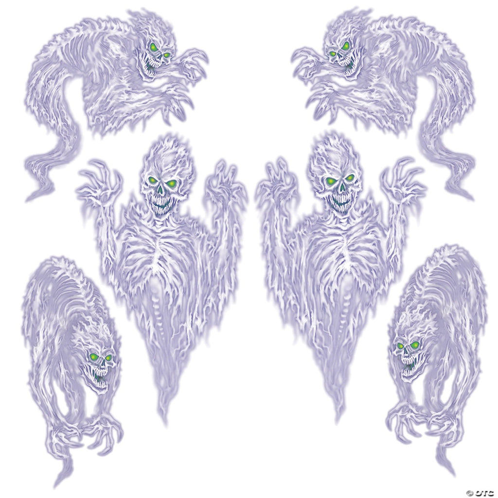 Skeletal reapers will haunt your nightmares.Bone chilling! Includes: 6 ghostly spirits all poised and ready to strike! Polypropylene. Measure between 31"-39". Need to be cut out. 1 sheet right facing ghosts, 1 sheet left facing ghosts.