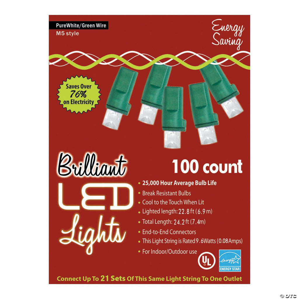 String light set perfect for Christmas or party decoration! 100-count M5 Brilliant LED lighting. Lights have green cord with end to end connectors. String has a 22.8 ft lighted length/24.2 ft total length. Rated: 9.6 watts (0.08amps)/set 3.0A/120V Fuse Spare 1 bulb/1 fuse. Connect up to 21 sets of the same light string to one outlet. Indoor/outdoor use.