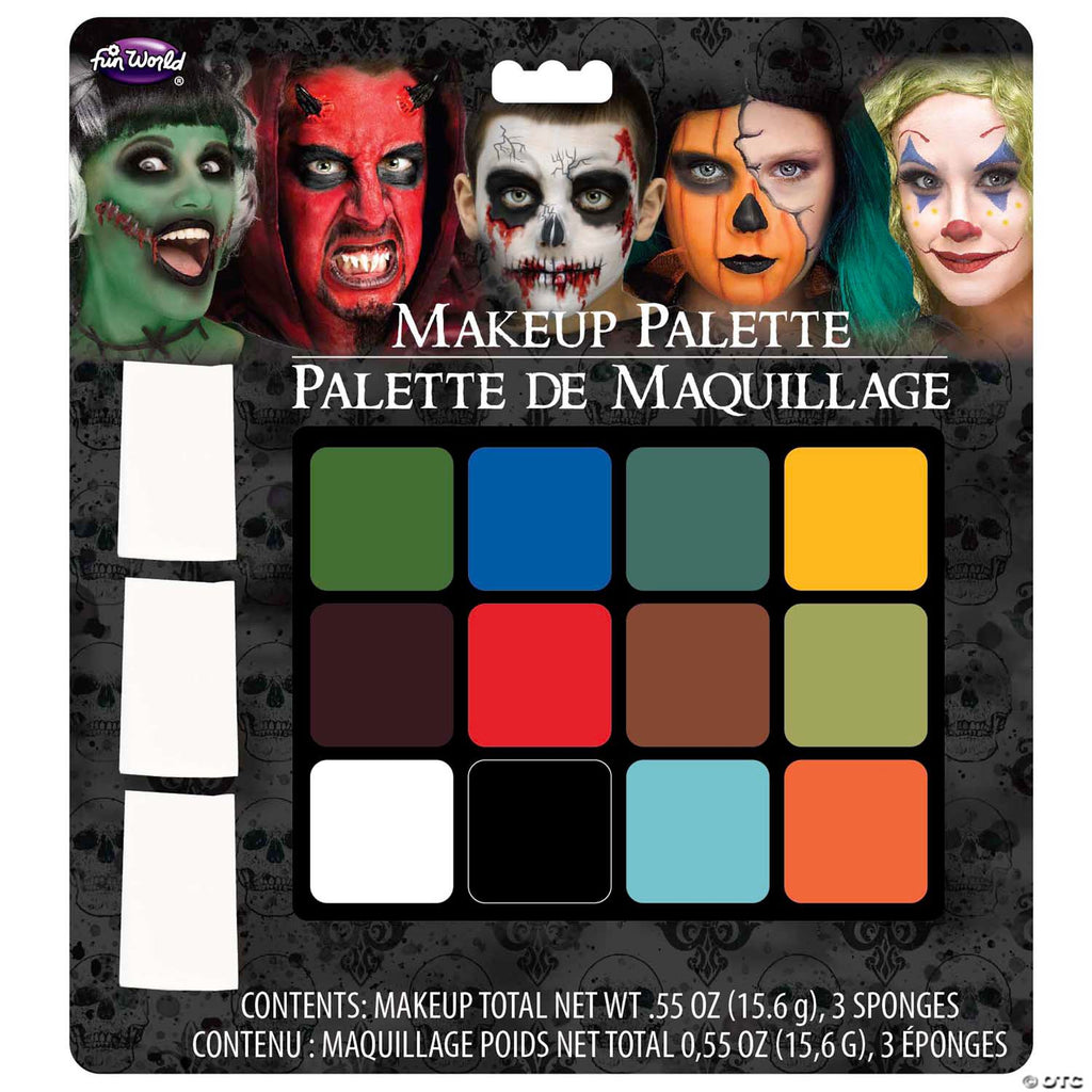 Product Description: Create a multitude of Halloween looks with our 12-Color Makeup Palette! Features white, black, reds, yellow, blues, and green, you can design anything from monsters to fantasy characters. Oil-based cream makeup glides on smoothly and washes off with mild soap and warm water. Total net weight .99 oz (28g).