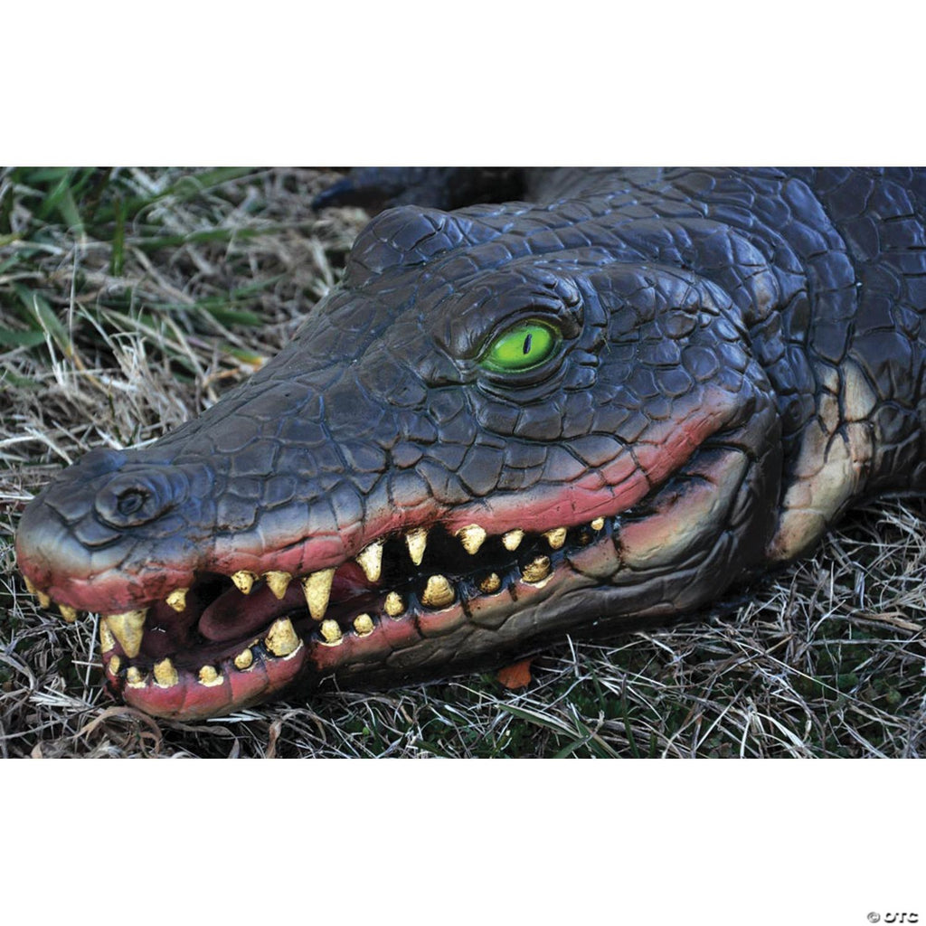 The 4-Foot Swamp Alligator looks just like the real deal!Made of foam-filled latex, the Alligator Prop has an excellent realistic paint finish on top. The underside of theAlligator Prop is hollow and unfinished and is made for sitting on a flat surface, or angled in a position so that the underside is not visible. Perfect prop for a spooky swamp scene, or fun yard decor! 48 inches long, 14 inches wide, 5 inches tall.