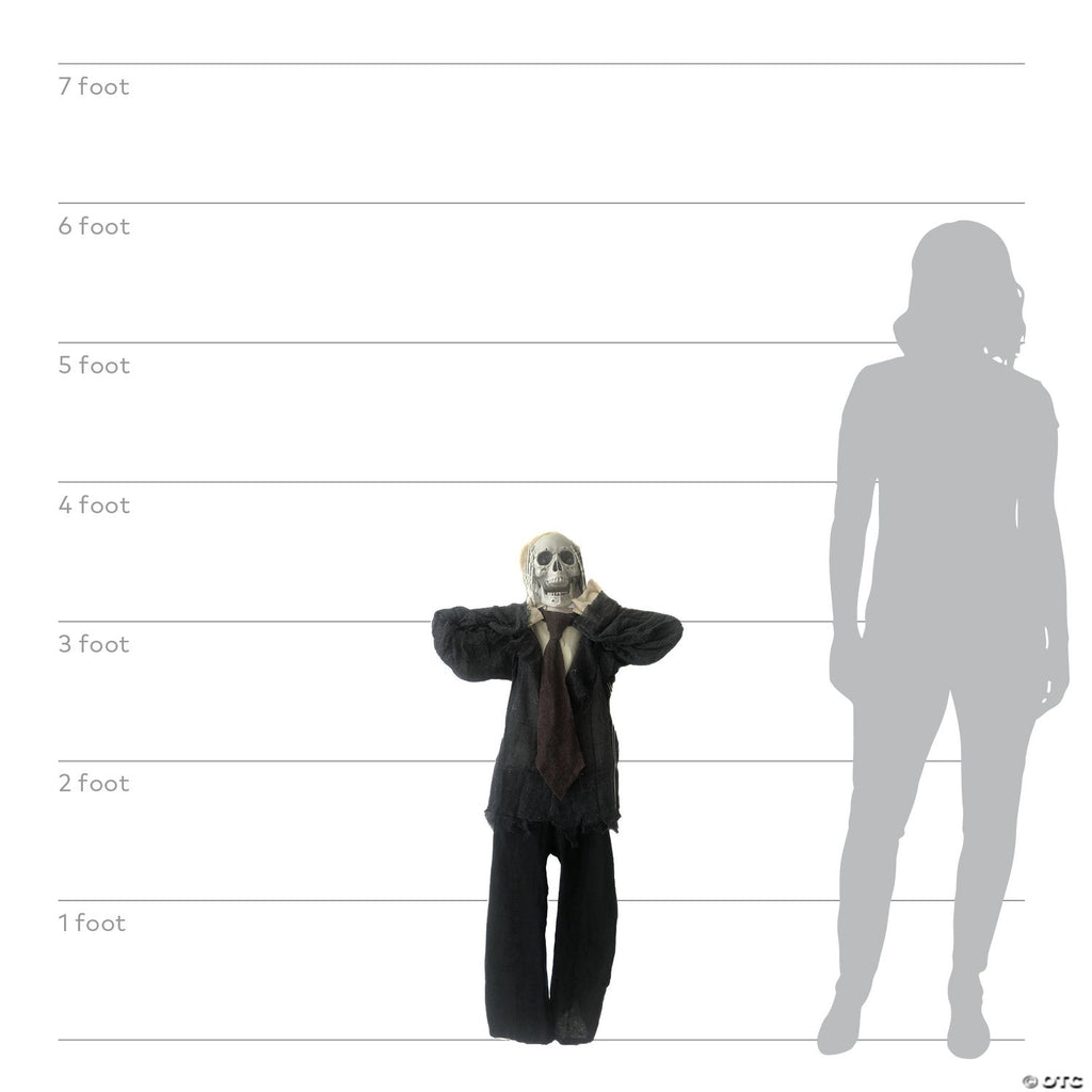 This spooky Hanging Animated Skeleton Man in a Suit is the perfect addition to your next haunted house party! Watch him lift his head from his shoulders while speaking two different humorous sayings with his crazy laugh! His Red Light-Up Eyes add to the scary effect. His Black Gauzy Suit with white shirt and tie gives a more dignified appearance, and he hangs from an almost invisible monofilament line. Try Me button is included and can be removed when necessary. Requires 3 AA Batteries, not included. Length is approximately 43 inches. Width at outstretched elbows is approximately 15 inches. The Skull itself is about 5 inches deep, 6 inches tall, and 5 inches wide.