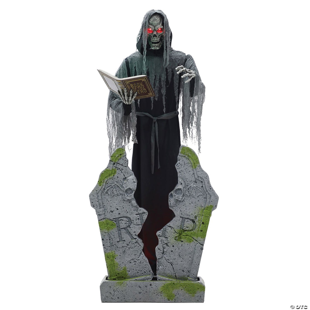 Spectacular 7 ft. Soul Stealer Animated Prop will be a show-stopper for your next haunted scene! Spine-chilling phantom moves at the waist from side to side, holding his Book of the Dead while his left arm moves and his head with moving jaw speaks several terrifying phrases. Red LED eyes peer out from a dark hood, and his dark tattered robe has ragged sleeves with long wispy gauze pieces that sway in the slightest breeze. As he speaks, the granite-look tombstone in front of him splits in half, appearing to show reddish fog coming from the grave! Plugs into any normal wall outlet. Complete assembly instructions are included. Add your own fog machine to achieve the effect shown. Fog machine is not included.