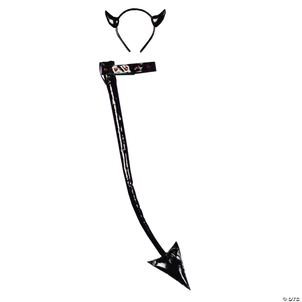 Matching leather-like headpiece and tail. Simply add your own tights and leotard and you have an instant costume. Plastic gemstone accents.