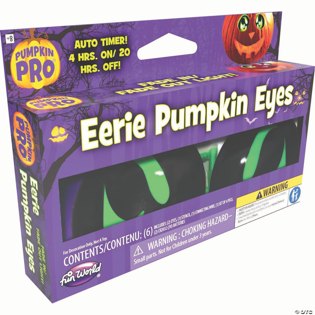 Add these light up Pumpkin Eyes to your carved pumpkin for a really cool look! Our Pumpkin Eyes have a fade in/out effect, with an expressive art style that is so much fun! Features two light-up eyes with a connecting wire, and includes a stencil to cut your pumpkin to fit, a set of 4 pegs to anchor the eyes on the inside, and 2 CR2032 batteries (included). An auto timer provides 4 hours on, 20 hours off. Perfect Halloween decor timing! Take your pumpkins to the next level!