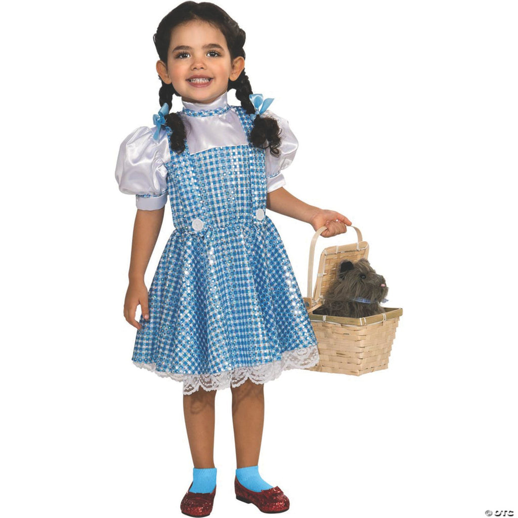 Now your little girl can become the heroine from the classic movie The Wizard of Oz! Blue dress and two hair bows with holographic sequins. A strikingly beautiful costume. Stockings shoes and Toto not included.