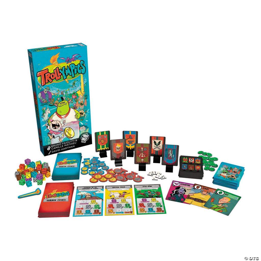 This board game challenges 3-6 players to gather a team to compete in the Trollympics and the player that earns the most points after getting through a winter and summer season is the winner. • For 3-6 players. • Play time approximately 45 minutes. • Age range 14+ • © 2025 Trick or Treat Studios